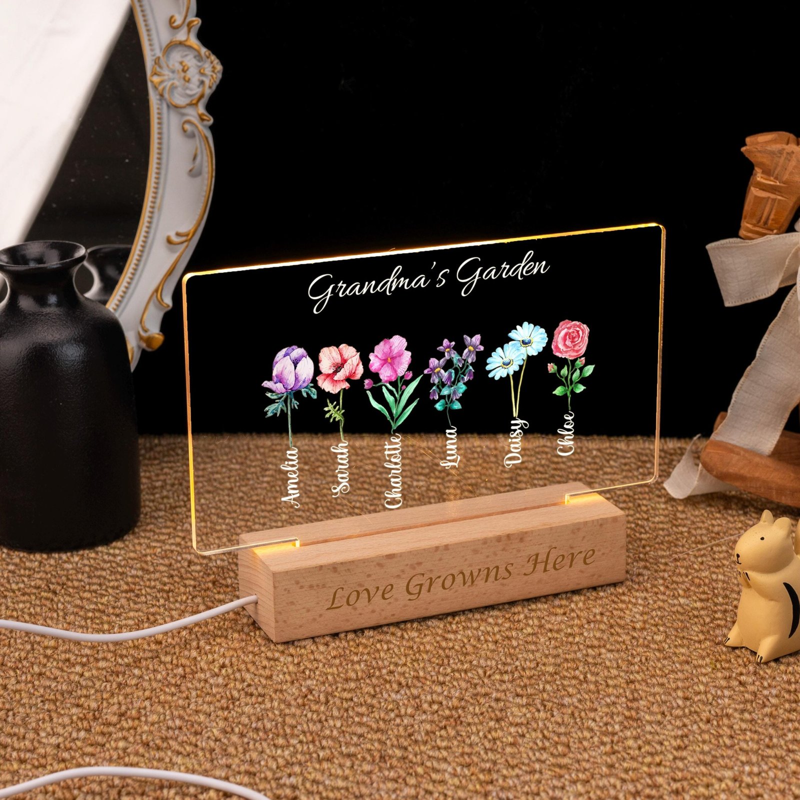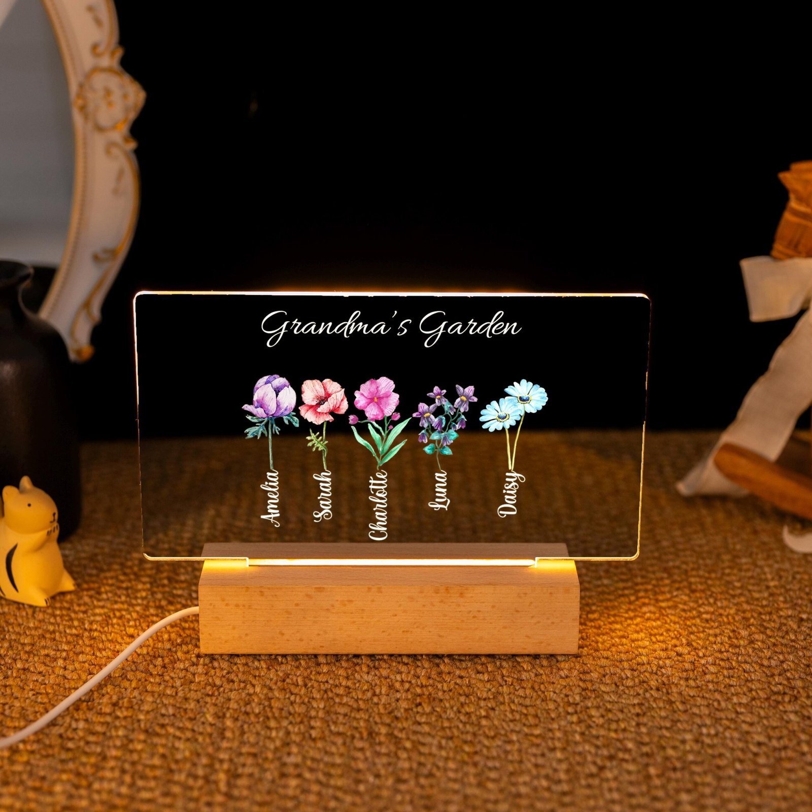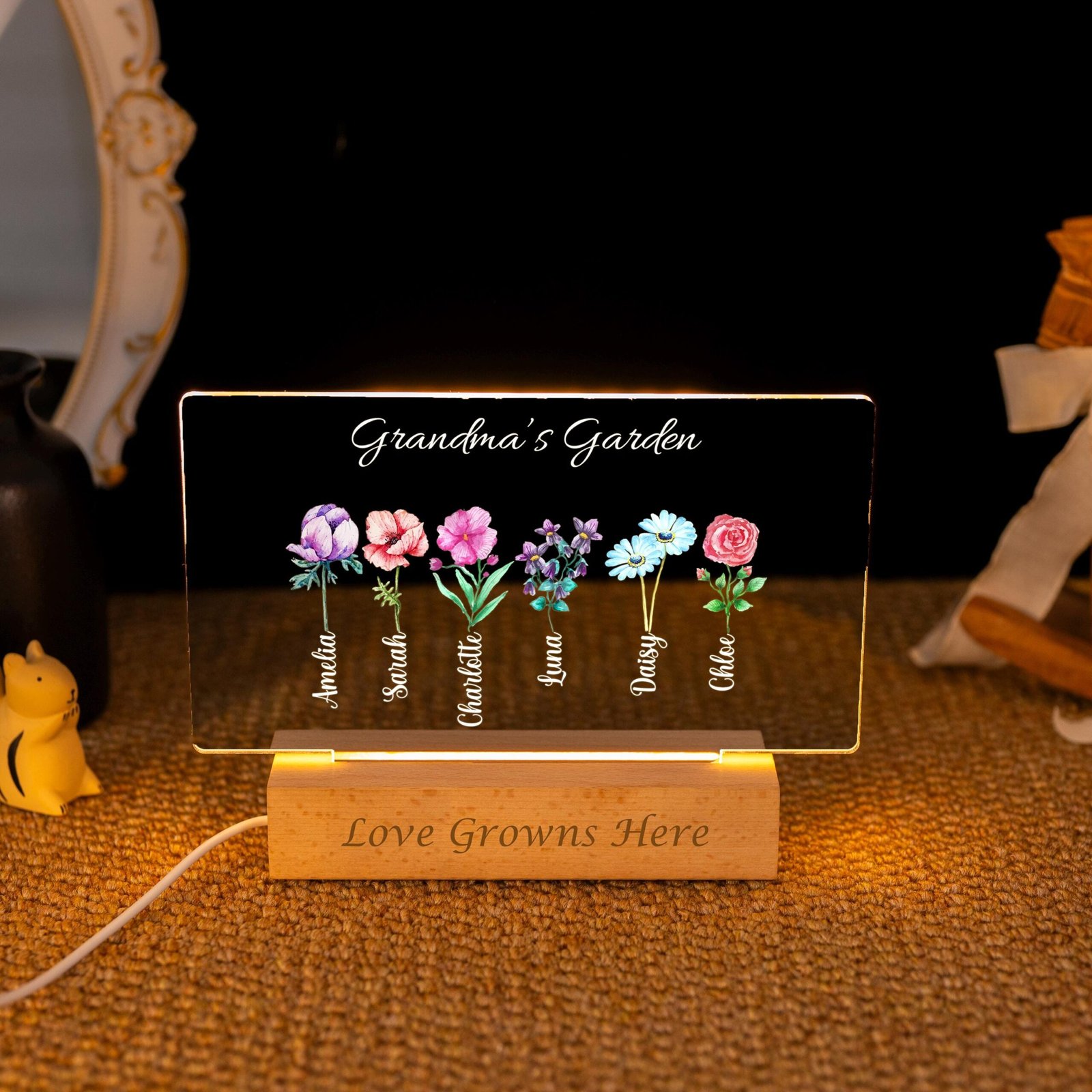 Unlike generic gifts, this keepsake blends personalization, symbolism, and functionality. The warm LED glow makes it practical as a night light or ambient lamp, while the customized names and flowers make it deeply sentimental. Every glance at it will remind Grandma of the love that surrounds her.