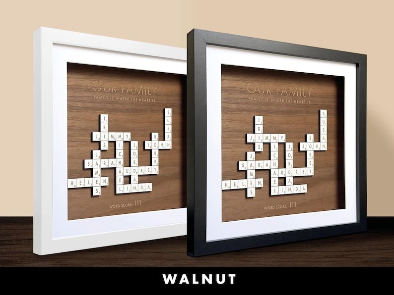 Share the gift of personalized memories with a Scrabble family names frame—a perfect Christmas gift, a keepsake for grandparents’ birthdays, or a unique family tree display that honors your heritage. Each custom letter tile adds a personal touch, making this frame a meaningful and heartwarming present that symbolizes the bond and connection within your family. Preserve your family’s legacy with this special and sentimental keepsake.